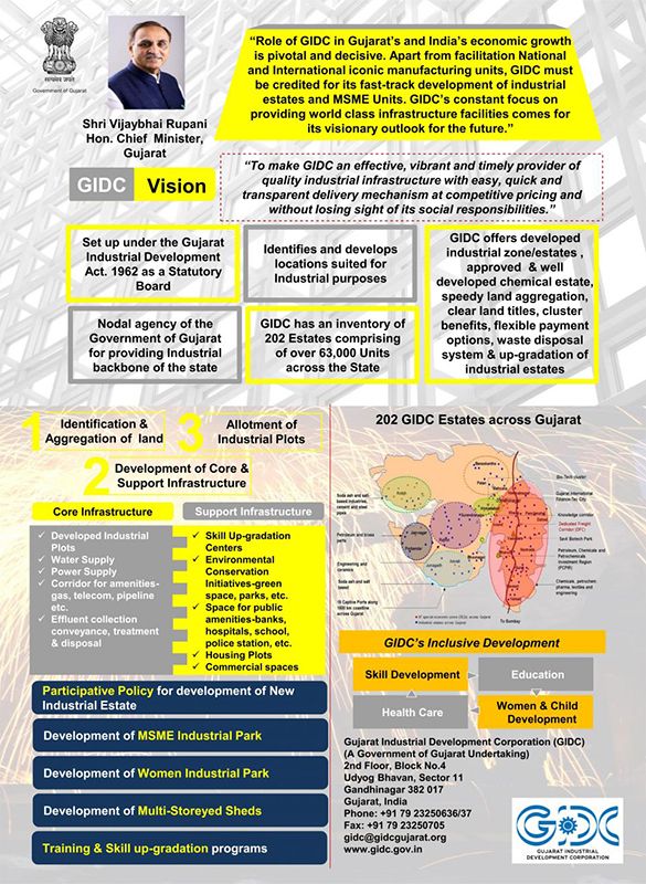 Gujarat Industrial Development Corporation (GIDC) has been created for securing the orderly establishment and organization of industries in industrial areas and industrial estates in the state. Main role of the Gujarat Industrial Development Corporation (GIDC) is to identify locations suitable for industrial development and create industrial estates with infrastructure such as roads, drainage, electricity, water supply, street lights, and ready-to-occupy factory sheds.